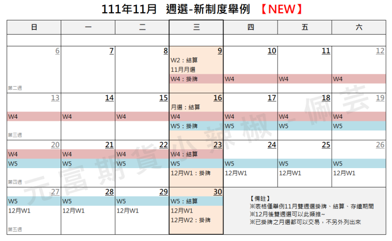 | 111/11/23(三) | 是11月w4週選結算日,並同時加掛12月w1週選 |